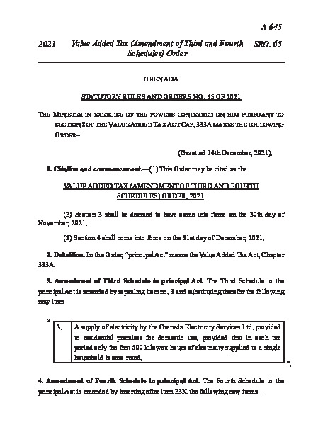 SR&O 65 of 2021 Value Added Tax (Amendment of Third and Fourth Schedules) Order, 2021