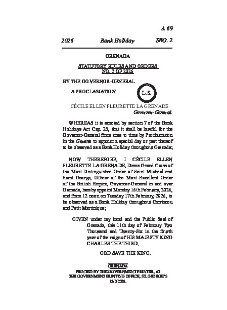 SR&O 2 of 2026 Bank Holiday Proclamation, 2026