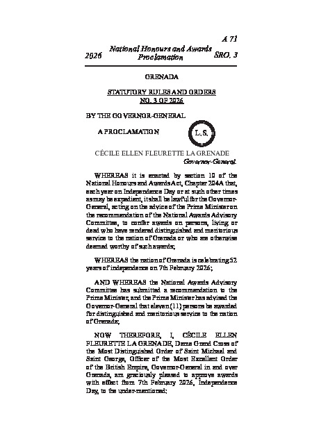 SR&O 3 of 2026 National Honours and Awards Proclamation, 2026